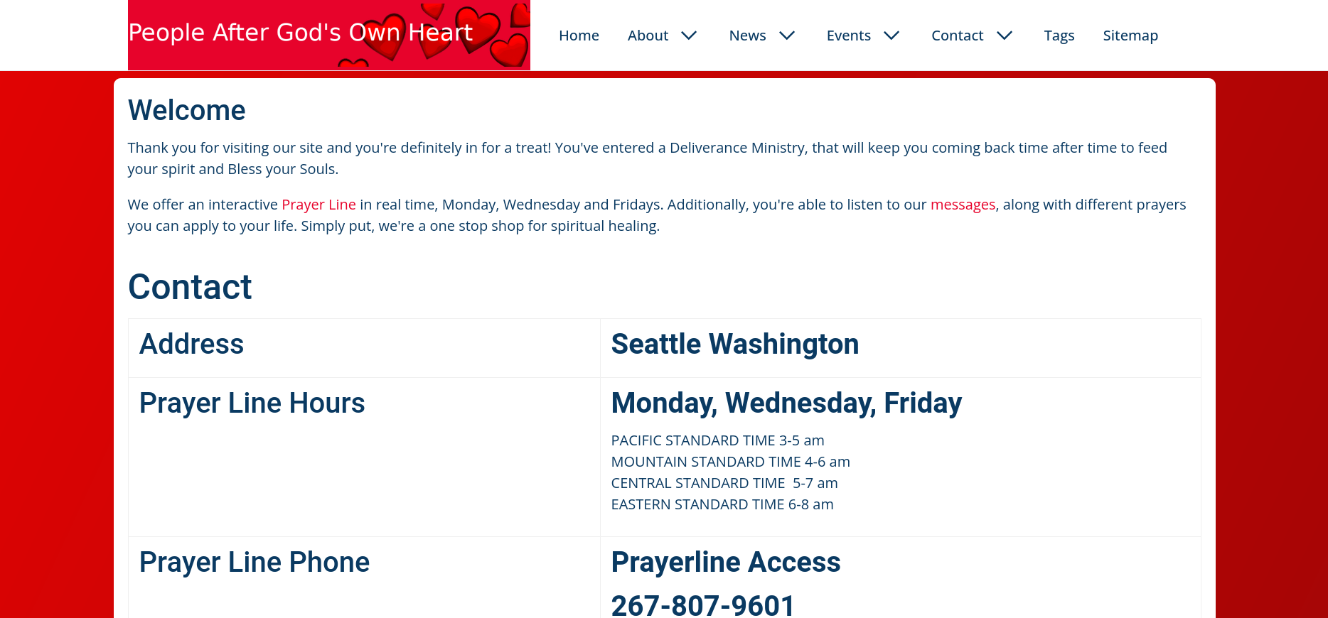 "People After God's Own Heart" is a non-profit business that provides the the prayer line for everyone. They are a small family run organization in Seattle, Washington.